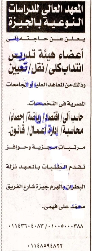 يعلن المعهد العالى للدراسات النوعية بالجيزة، عن حاجته الى اعضاء هيئة التدريس ومعاونيهم، عن طريق انتداب كلى، او نقل، او تعيين، من الجامعات المصرية والمعاهد العليا، وعلى الراغبين فى الحصول على الوظيفة، تقديم الطلبات شخصيا، باسم الدكتور عميد المعهد، على العنوان المنشور، فى جريدة الجمهورية، اليوم الاربعاء، الموافق 24-3-2021.
