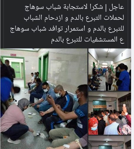 وجه عدد من نشطاء مواقع التواصل الاجتماعي "فيسبوك" التحية لشباب محافظة سوهاج بعد استجابة شباب سوهاج لحملات التبرع بالدم و ازدحام الشباب للتبرع بالدم و استمرار توافد شباب سوهاج علي المستشفيات للتبرع بالدم.
