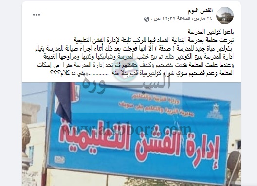 نشر أحد المعلمين تدوينة علي صفحة الفشن اليوم علي موقع فيسبوك، عن واقعة غريبة حدثت في إحدي مدارس الفشن بمحافظة بني سويف حيث تبرعت معلمة بمدرسة ابتدائية تابعة لإدارة الفشن التعليمية بكولدير مياة جديد للمدرسة "صدقة" الا انها فوجئت بعد ذلك أثناء اجراء صيانة للمدرسة بقيام ادارة المدرسة ببيع الكولدير مثلما تم بيع خشب المدرسة وشبابيكها وكتبها ومراوحها القديمة.