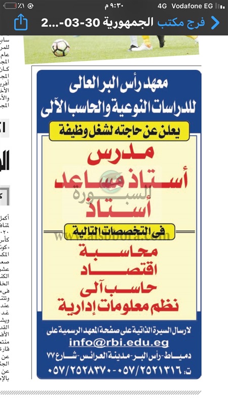 يعلن معهد رأس البر عن وظائف جديدة لأعضاء هيئة التدريس وذلك في التخصصات التالية:
