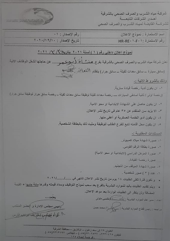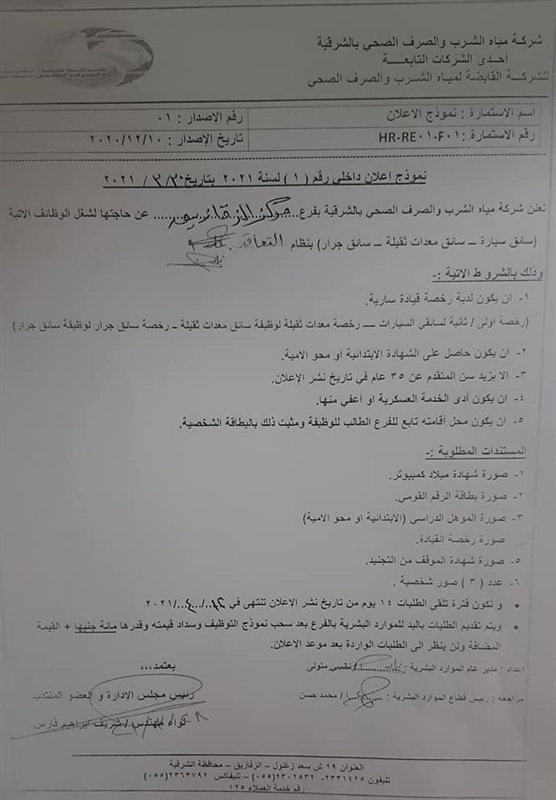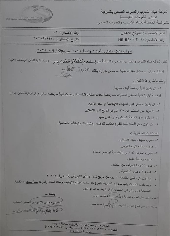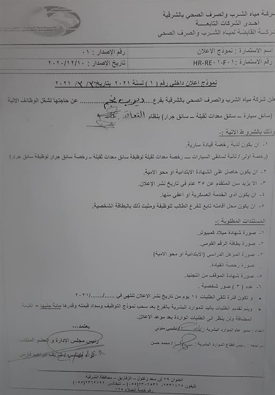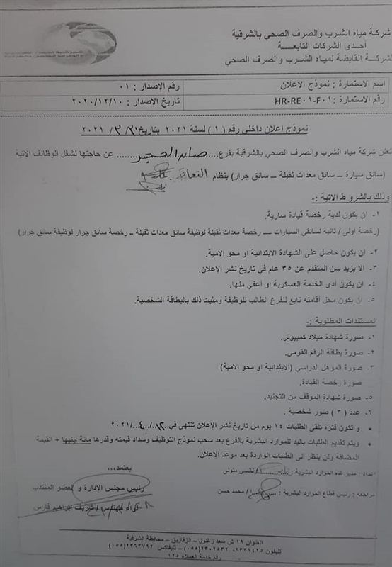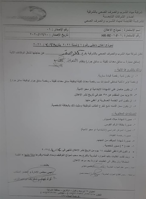تعلن شركة مياه الشرب الصرف الصحي بالشرقيه، عن حاجتها لسائقين بالتعاقد للعمل بالأفرع الآتية: "ديرب نجم - منشأة أبوعمر- مدينة الزقازيق - مركز الزقازيق - صان الحجر - كفر صقر".