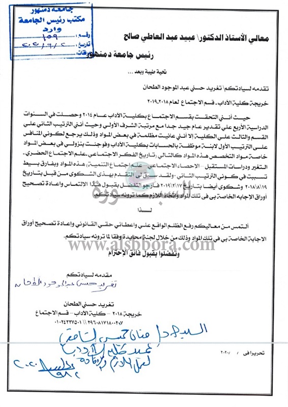 وكشف موقع السبورة ان الطالبة تغريد قامت بشكوى ضد كلية الاداب بالجامعة، مطالبة بتصحيح اوراق اجابتها، الا ان عميدة الكلية فى عام 2018-2019، قامت بتدشيت اوراق الاجابة الخاصة بالدفعة كاملة ضاربة بالقوانين عرض الحائط، حيث لا يجوز ان تقوم الكلية بتدشيت اوراق الاجابة الا بعد مرور 5 سنوات.