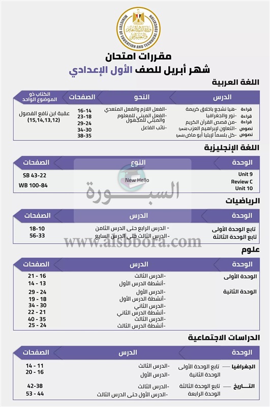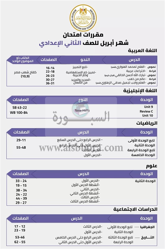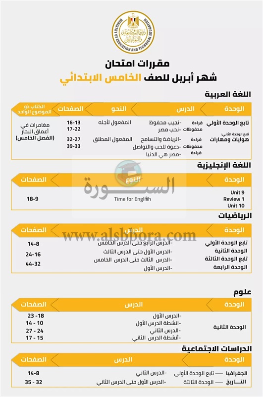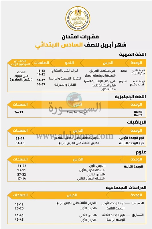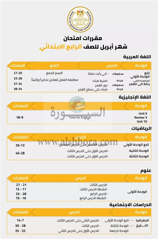 نشرت وزارة التربية والتعليم، المقررات والمناهج لامتحان شهر أبريل وذلك لجميع الصفوف من الصف الرابع الابتدائي وحتى الصف الثاني الإعدادي من خلال الجداول التالية: