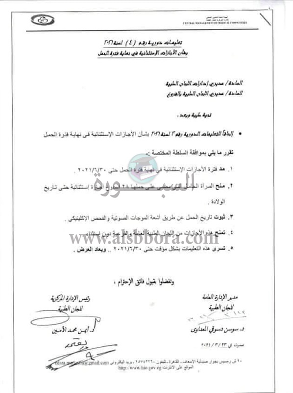 حيث أصدرت الهيئة العامة للتأمين الصحي قرارا باستمرار منح الموظفة الحامل التي مضى علي حملها ٢٨ اسبوع وحتي تاريخ الولادة اجازة استثناءية مدفوعة الأجر حتي ٣٠- ٦ -٢٠٢١. .