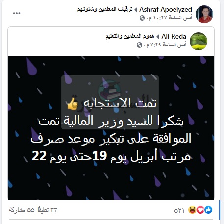 وقال رضا في تدوينته "تمت الاستجابه شكرا للسيد وزير المالية تمت الموافقة على تبكير موعد صرف مرتب أبريل يوم 19حتى يوم 22".