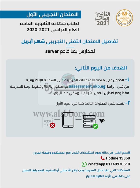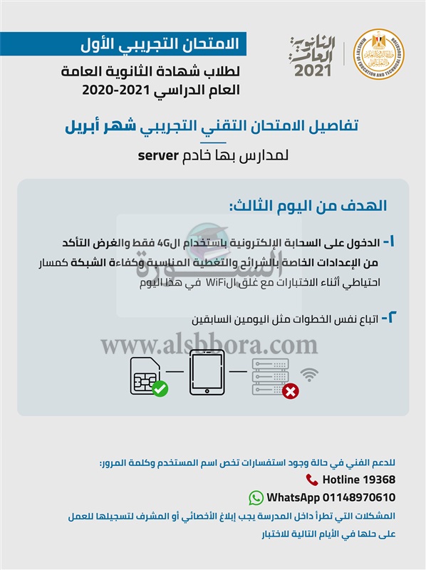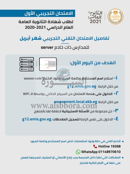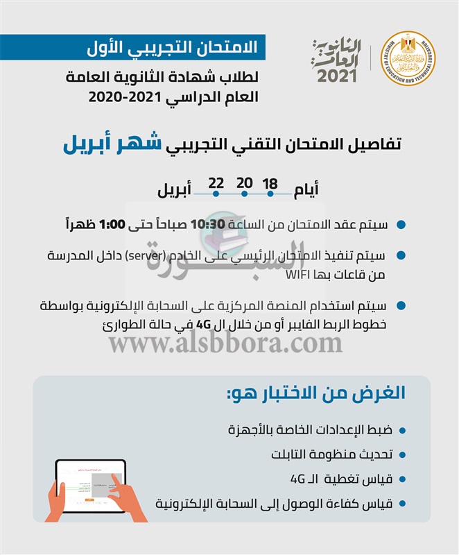 تعرف علي تفاصيل الاختبار التقني بشهر أبريل لطلاب الصف الثالث الثانوي العام الدراسي ٢٠٢٠ - ٢٠٢١ والذي يعقد في الفترة من ١٨ وحتى ٢٢ أبريل من الساعة ١٠:٣٠ صباحاً وحتى ١:٠٠ ظهراً للأهداف التالية: