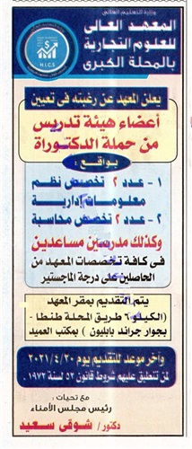 يعلن المعهد العالى للعلوم التجارية، بالمحلة الكبرى، عن حاجته الى اعضاء هيئة التدريس، من حملة الدكتوراة، وعلى الراغبين فى الحصول على الوظيفة، تقديم الطلبات بمقر المعهد، على ان يكون اخر موعد للتقديم، يوم 20 ابريل 2021.