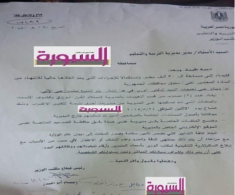 ايماء لى مسابقة ال30 الف معلم واستكمالا للاجراءات التى يتم اتخاذها حاليا للانتهاء من تسكين السادة المعلمين على مستوى الجمهورية