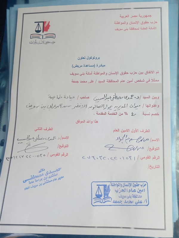وقع علي محمد جمعة أمين عام حزب "حقوق الإنسان والمواطنة" بمحافظة بني سويف، بروتوكول مساعدة مريض مع الدكتور حمدي مصطفي عبد الحسيب، استشاري أول جراحة عامة .
