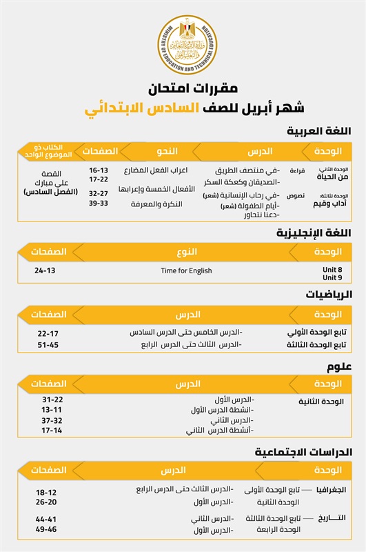 اعلنت وزارة التربية والتعليم والتعليم الفنى، عن مقررات شهر ابريل، لطلاب وطالبات الصف السادس الابتدائى، والذى تعقد امتحاناتهم خلال الاسبوع المقبل، على ان تبدأ يوم الثلاثاء، الموافق 27 ابريل الجارى.