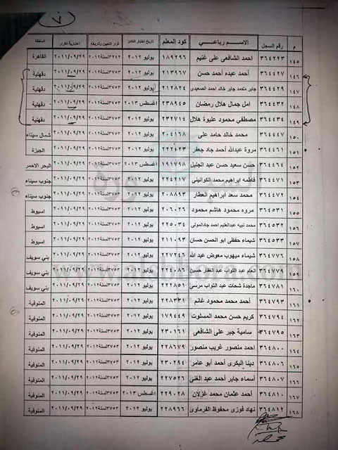 "المادة الاولى" نقل المذكور اسما ئهم من شاغلى وظائف التعليم المثبتين بوظيفة معلم مساعد والذين اجتازوا اختبارات الكادر بعد قرا تثبيتهم طبقا لما ورد من الاكاديمية المهنية للمعلمين الى وظيفة معلم (هيئة التنعليم )اعتبارا من 25/9/2014 بالمناطق الموضحة قرين كل اسم منهم وبالكشوف الموضحة