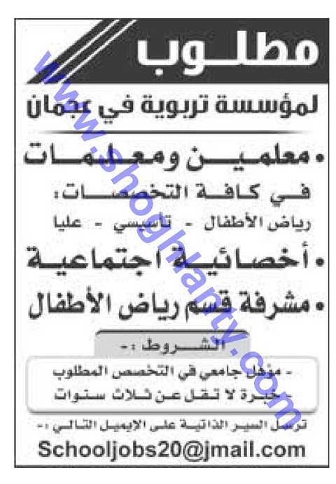 تعلن مؤسسة تربوية في عجمان بالإمارات عن حاجتها لمعلمين ومعلمات في كافة التخصصات (رياض أطفال-تأسيسي- عليا).