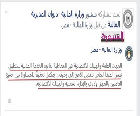 اكدت وزارة المالية عبر صفحة خاصة بها علي ما انفردت بة السبورة وهو إن الجهات العامة والهيئات الاقتصادية غير المخاطبة بقانون الخدمة المدنية ستطبق نفس المبدأ الخاص بتعديل الاجور الي وظيفي ومكمل تحقيقا للمساواة بين جميع العاملين بالجهاز الاداري والإدارة المحلية والهيئات الاقتصادية.