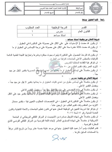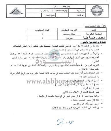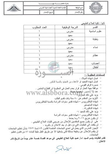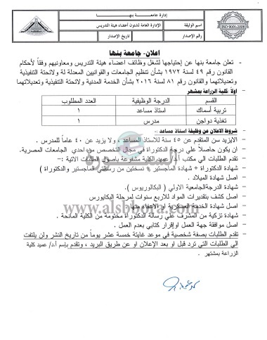 تعلن جامعة بنها عن وظائف جديدة لأعضاء هيئة التدريس في مختلف التخصصات علما بأن أخر موعد للتقديم الأربعاء المقبل وفقا لنص الإعلان التالي: