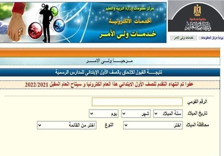 فتح باب التقدم للتسجيل الإلكتروني للصف الاول الابتدائي ليبدأ التقديم في الفترة من 1- 6 حتى 30- 6 بحيث لا يقل عن 6 سنوات و لا يزيد عن 9 سنوات.