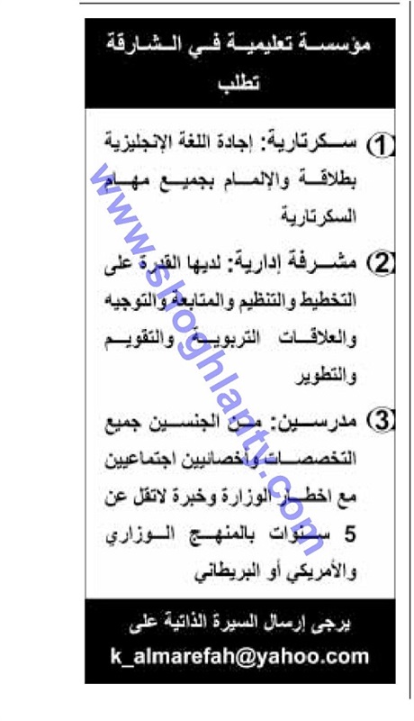 تعلن مؤسسة تعليمية في الشارقة بدولة الإمارات عن حاجتها علي مدرسين من الجنسين في جيمع التخصصات وأخصائيين اجتماعيين مع اخطار الوزارة وخبرة لا تقل عن 5 سنوات بالمنهج الوزاري .