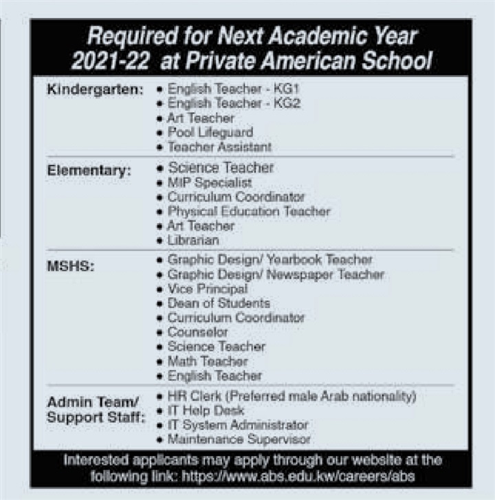 تعلن مدرسة كويتية عن وظائف جديدة للمعلمين والمعلمات وفقا لنص الإعلان التالي: