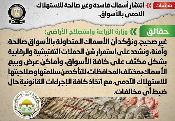 وقام المركز الإعلامي لمجلس الوزراء بالتواصل مع وزارة الزراعة واستصلاح الأراضي، والتي نفت تلك الأنباء، مُؤكدةً أنه لا صحة لانتشار أسماك فاسدة وغير صالحة للاستهلاك الآدمي بالأسواق، وأن الأسماك المتداولة بالأسواق صالحة وآمنة.