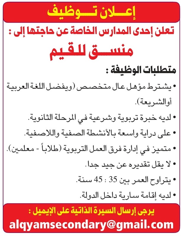 تعلن مدرسة قطرية عن وظائف جديدة للمعلمين والمعلمات وفقا لنص الإعلان التالي:
