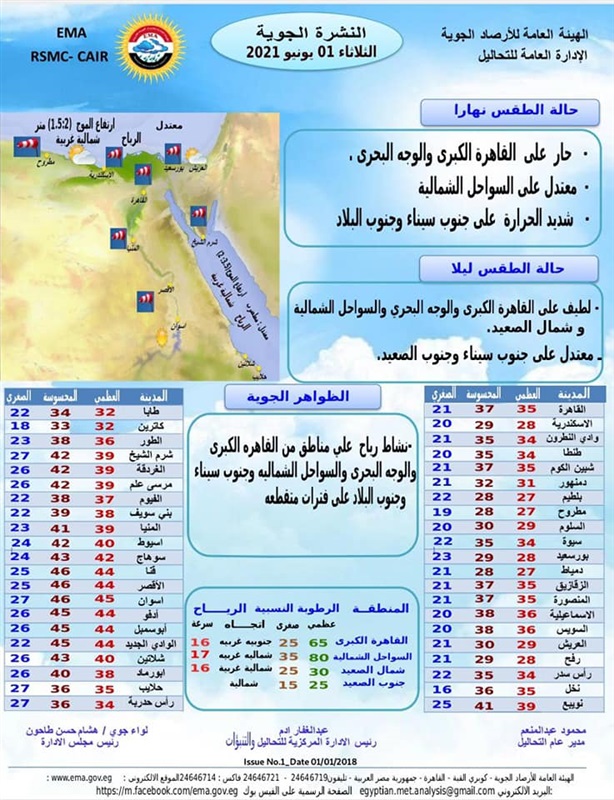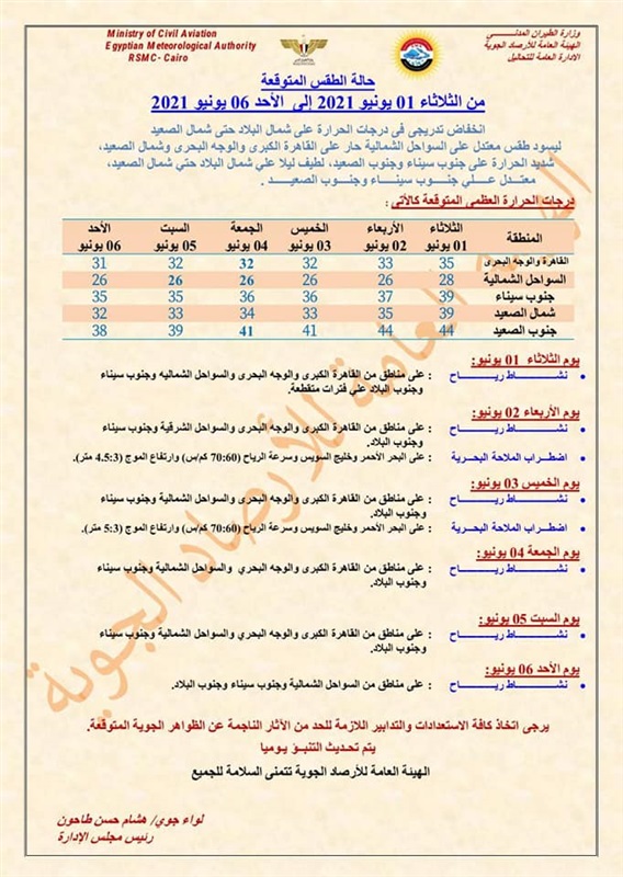 اعلنت هيئة الارصاد الجوية انباء سارة بشأن حالة الطقس فى جمهورية مصر العربية خلال الفترة من الثلاثاء الموافق اول يونيو الى يوم الاحد الموافق 6 يونيو 2021.