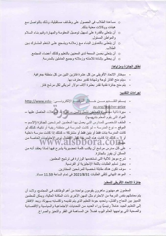 وجاء نص الخطاب الذى حصل موقع السبورة على نسخة منه "الحاقا لما سبق بشأن كتاب السفير مساعد وزير الخارجية مدير ادراة المنظمات والتجمعات الافريقية والمرفق به مذكر مفوضية الاتحاد الافريقى لفتح باب الترشيح للمرحلة الثالثة من جائزة الاتحاد الافريقى للمدرسين 2021 والمتضمنة الورقة المفاهيمية الخاصة بالمسابقة وخطوات الترشح وشروط الاختيار والجوائز المرصودة للمسابقة.
