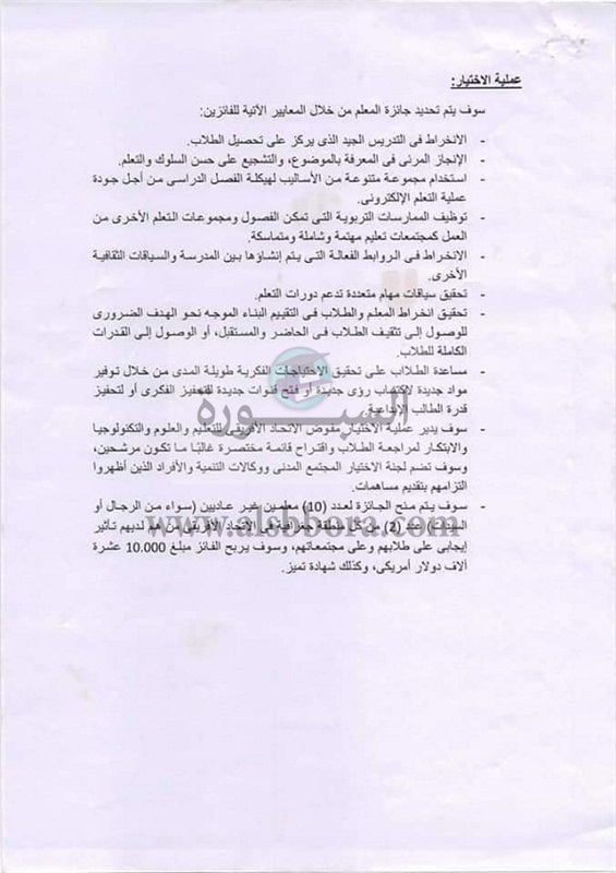 الجدير بالذكر أن وزارة التربية والتعليم والتعليم الفنى، قد ارسلت خطابا مهما الى جميع المديريات التعليمية، بشأن ترشيحات لافضل المعلمين على مستوى افريقيا خاصة، وانه تم فتح باب الترشح لهذه الجائزة، على ان يكون آخر موعد لتقديم اسماء المرشحين من المديريات على وزير التربية والتعليم لاعتمادهم ومشاركتهم فى هذه الجائزة.