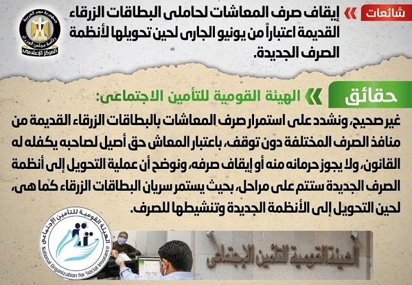 وقام المركز الإعلامي لمجلس الوزراء بالتواصل مع الهيئة القومية للتأمين الاجتماعي، والتي نفت تلك الأنباء، مُؤكدةً أنه لا صحة لإيقاف صرف المعاشات لحاملي البطاقات الزرقاء القديمة اعتباراً من يونيو الجاري لحين تحويلها لأنظمة الصرف الجديدة.