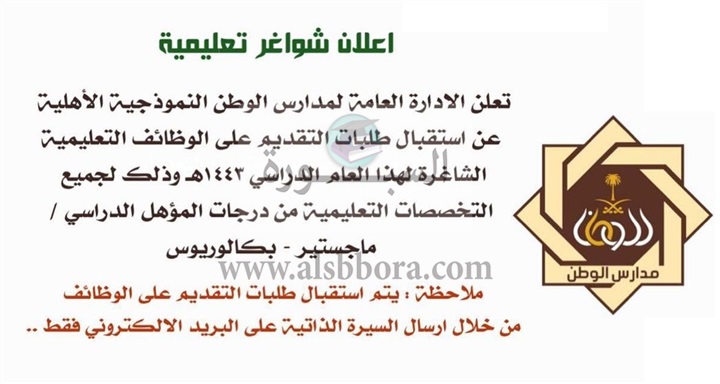 تعلن مدارس الوطن النموذجية الأهلية في السعودية عن حاجتها إلى جميع التخصصات التعليمية لحملة الماجستير والدكتوراه وفقا لنص الإعلان التالي: