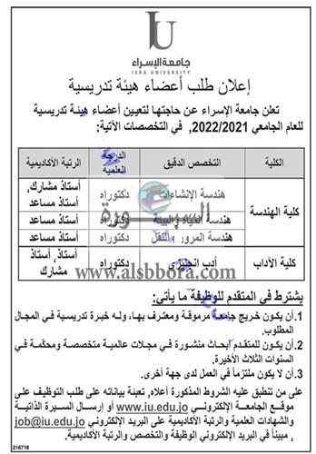 أعلنت جامعة الإسراء الأردنية عن وظائف جديدة لأعضاء هيئة التدريس "من حملة الماجستير والدكتوراه" وفقا لنص الإعلان التالي: