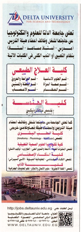 تعلن جامعة الدلتا عن وظائف جديدة لأعضاء هيئة التدريس في 20 تخصص علما بأن أخر موعد للتقديم الاثنين المقبل وفقا لو ننشر في نص الإعلان التالي: