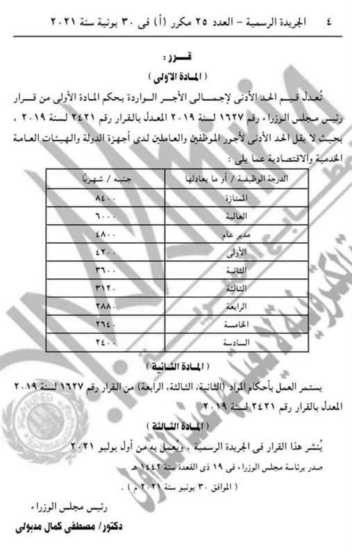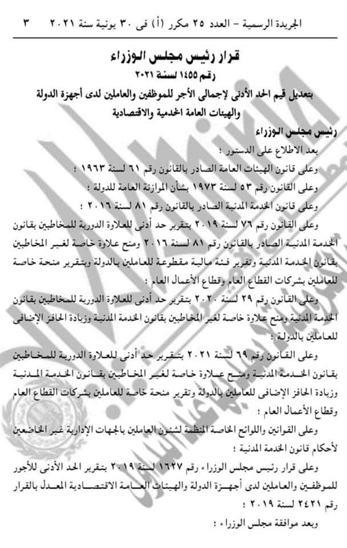 نشرت الجريدة الرسمية قرار رئيس مجلس الوزراء رقم ١٤٥٥ لسنة ٢٠٢١ بتعديل الحد الأدنى لإجمالي الأجر للموظفين والعاملين لدى أجهزة الدولة والهيئات العامة الخدمية والاقتصادية، لدى أجهزة الدولة والهيئات العامة الخدمية والاقتصادية.