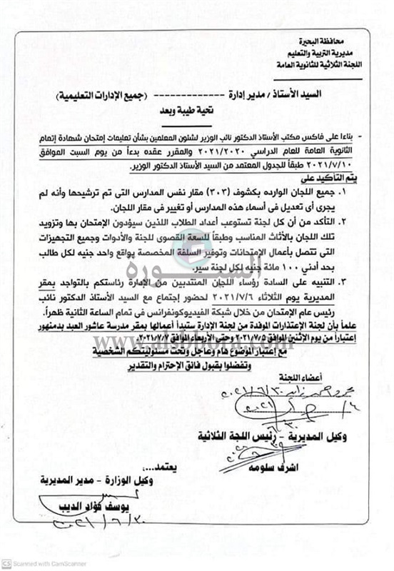 3- التنبيه على رؤساء اللجان المنتدبين من الادارة رئاستكم بالتواجد بمقر المديرية يوم الثلاثاء 6-7-2021 لحضور اجتماع الدكتور نائب رئيس عام الامتحان من خلال شبكة الفيديو كونفرانس فى تمام الساعة الثانية ظهرا.