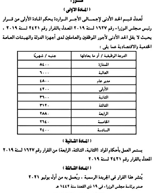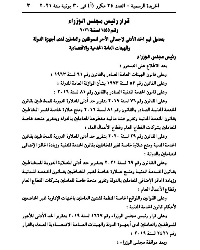 قرار رئيس مجلس الوزراء، الدكتور مصطفى مدبولى، رقم "١٤٥٥" لسنة ٢٠٢١ بتعديل قيم الحد الأدنى لإجمالي الأجر للموظفين والعاملين لدى أجهزة الدولة والهيئات العامة الخدمية والاقتصادية للدرجات المالية المختلفة.