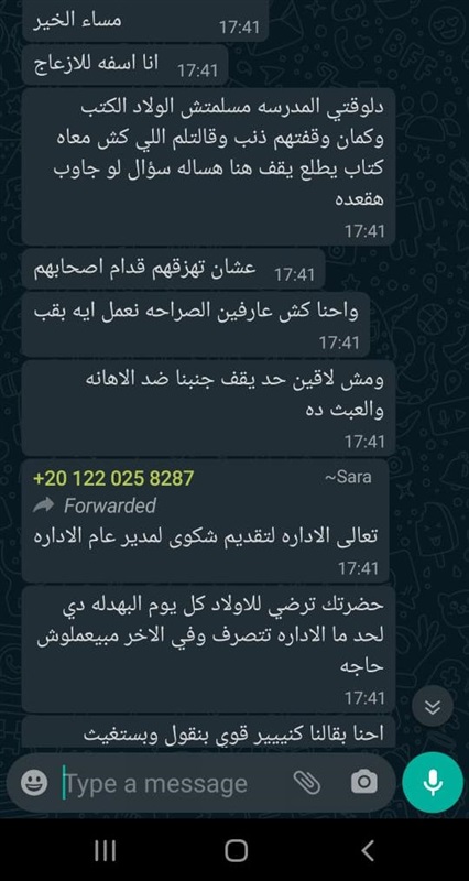 تانى يوم نزلت بوست على جروب اولياء الامور الخاص بينا عشان نشوف حل لان هناك اكتر من ولى امر عندهم نفس الشكوى قاموا اتصلوا بحسام واستدرجوا للمدرسة بحجة ان صاحب المدرسة موجود وعايز يقابل حضرتك عشان نحل الموضوع وتستلم الكتب ونفتح الاون لاين لما ذهب للمدرسه ودخل المكتب اعتدوا عليه بالضرب والإهانة وتكسير موبيله اتصلت عليه سمعتوا بيستنجد نزلت اجرى للمدرسة لانى ساكنه جنبها وفتحت اللايف استنجد باولياء الأمور لاقيت اخوه منتظرة بالعربية بره فبلغتوا بالحصل..