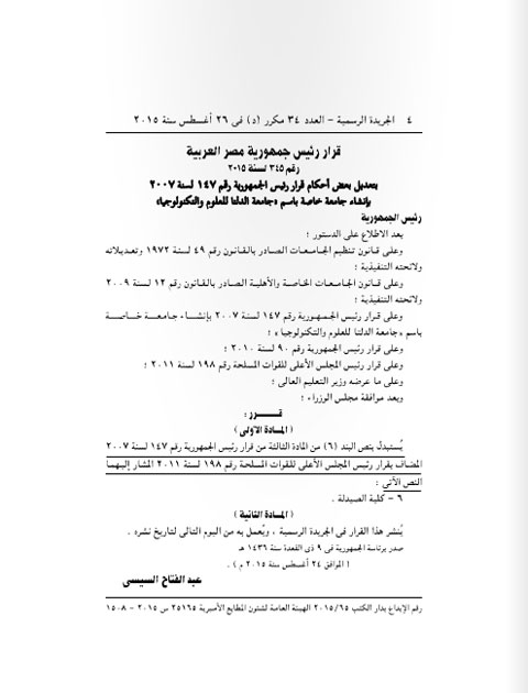 قرارا جمهوريا بإنشاء جامعة الدلتا للعلوم والتكنولوجيا وتعديل مسمي "كلية الصيدلة"