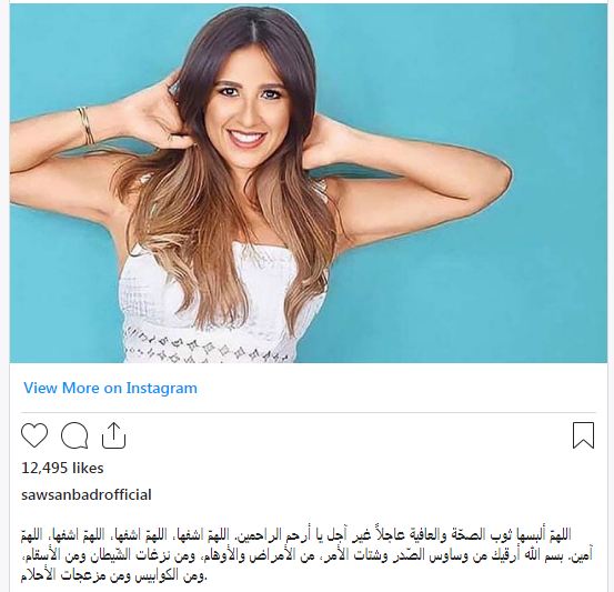 ونشرت الفنانة سوسن بدر صورة لياسمين عبد العزيز، عبر حسابها الشخصي بموقع التواصل الاجتماعي «إنستجرام».. قائلة: «اللهمّ ألبسها ثوب الصحّة والعافية عاجلًا غير آجل يا أرحم الراحمين.. اللهمّ اشفها، اللهمّ اشفها، اللهمّ اشفها، اللهمّ آمين.. بسم الله أرقيك من وساوس الصّدر وشتات الأمر، من الأمراض والأوهام، ومن نزغات الشّيطان ومن الأسقام، ومن الكوابيس ومن مزعجات الأحلام».