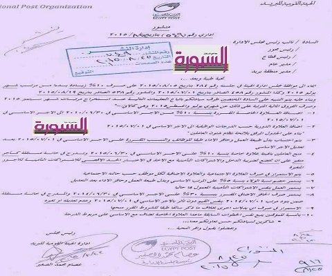 اصدرت الهيئة القومية للبريد المنشور الإداري رقم 549 لسنة 2015 م بصرف علاوه خاصة 10% وضم علاوة 2010 و تعديل الحوافز و البدلات طبقا لأساسي 1 - 7 - 2015 م بعد تعديل الأجر الأساسي.