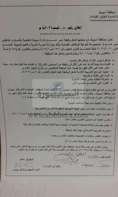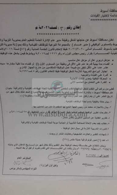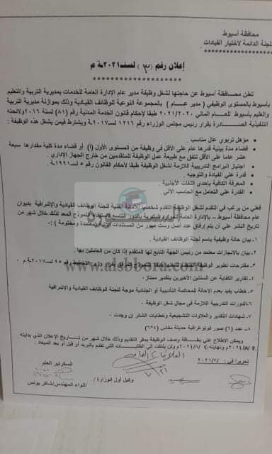 تعلن مديرية التربية والتعليم، بمحافظة أسيوط، عن حاجتها الى وظائف قيادية من بين المعلمين، وذلك طبقا لاحكام قانون الخدمة المدنية "81" لسنة 2016 الصادر بقرار رئيس مجلس الوزراء رقم 1216 لسنة 2017.