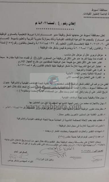 وتابعت مديرية التربية والتعليم بأسيوط، عن حاجتها لشغل الوظائف القيادية والاشرافية الشاغرة لكل من الوظائف التالية:
