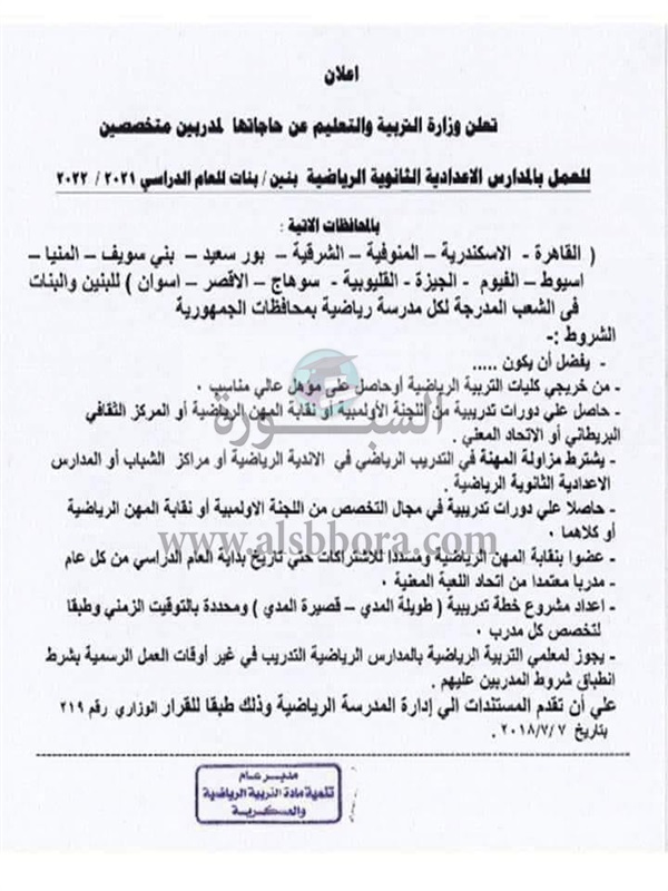 تعلن وزارة التربية والتعليم عن حاجتها لمدربين متخصصين للعمل بالمدارس الإعدادية الثانوية الرياضية بنين - بنات للعام الدارسي 2021 -2022 بالمحافظات التالية: