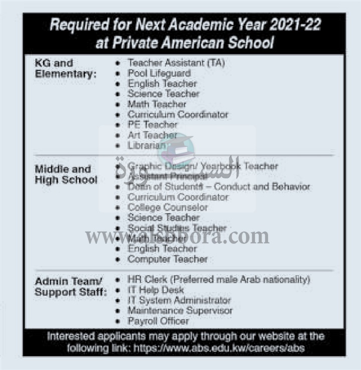 تعلن مدرسة خاصة في دولة الكويت عن ظائف جديدة للمعلمين والمعلمات وذلك في التخصصات التالية: