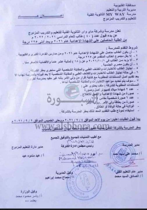 - أن يكون الطالب حاصل على شهادة إتمام مرحلة التعليم الأساسي (الإعدادية العامة) للعام الدراسي 2020 - 2021، والحد الأدنى لمجموع القبول 250 درجة.