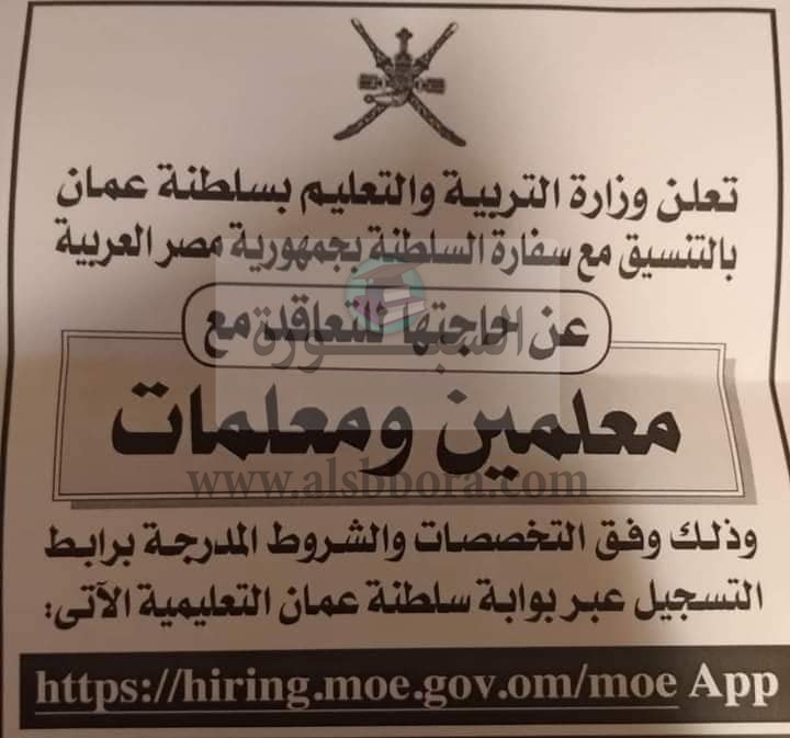 تعلن وزارة التربية والتعليم العمانية عن حاجتها للتعاقد مع معلمين ومعلمات مصريين وفقا لنص الإعلان التالي: