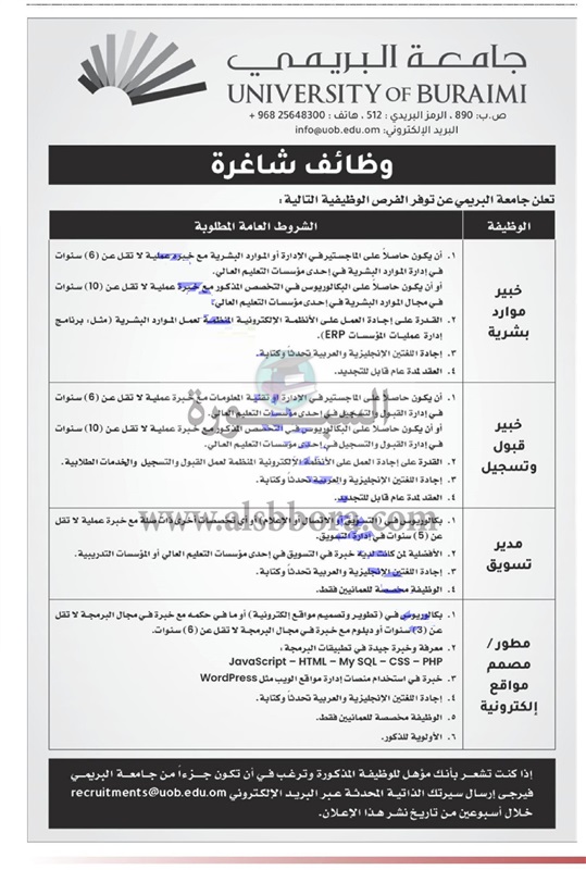 تعلن جامعة البريمي العمانية عن وظائف جديدة لحملة الماجستير وفقا لنص الإعلان التالي:
