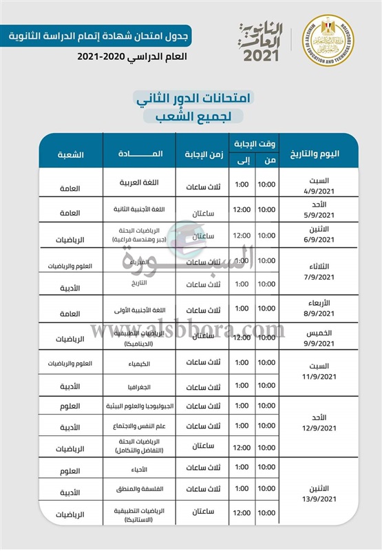 نشرت وزارة التربية والتعليم، جدول امتحانات طرب الثانوية العامة للدور الثاني، وذلك لجميع الشُعب العام الدراسى الحالى وتضمن الجدول التالي: