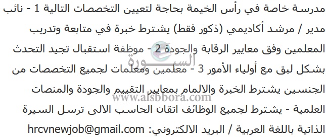 تعلن كبري مدارس رأس الخيمة عن وظائف جديدة للمعلمين والمعلمات وذلك وفقا لنص الإعلان التالي: