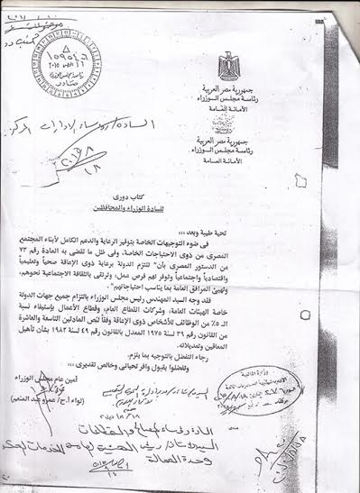 اصدر مجلس الوزراء كتابا دوريا للمحافظين وكافة المصالح والقطاعات يوصي بضرورة استيفاء 5 % من الوظائف للاشخاص ذوي الاعاقة وذالك وفقا لنص المادتين 9 و 10 من القانون رقم 39 لسنة 1975 المعدل بالقانون 49 لسنة 1983 بشأن تأهيل المعاقين وتعديلاتة .