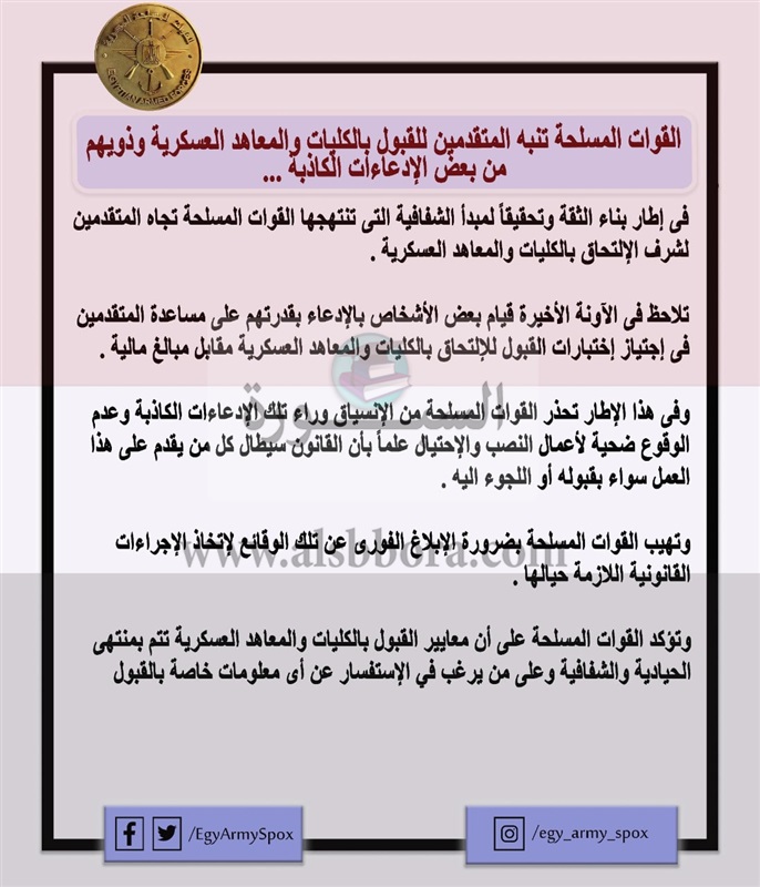 أصدر المتحدث العسكري عقيد أ.ح. غريب عبد الحافظ غريب المتحدث العسكري الرسمي للقوات المسلحة، القوات المسلحة تصدر تحذيرا هاما المتقدمين للقبول بالكليات والمعاهد العسكرية وذويهم تضمن الآتي: