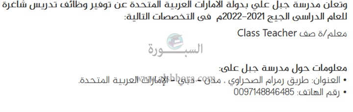 تعلن مدرسة جبل علي الإماراتية عن وظائف جديدة للمعلمين والمعلمات وفقا لنص الإعلان التالي: