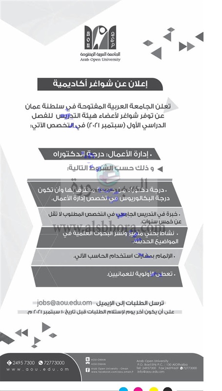 تعلن الجامعة العربية المفتوحة في سلطنة عمان عن وظائف جديدة لأعضاء هيئة التدريس وفقا لنص الإعلان التالي: